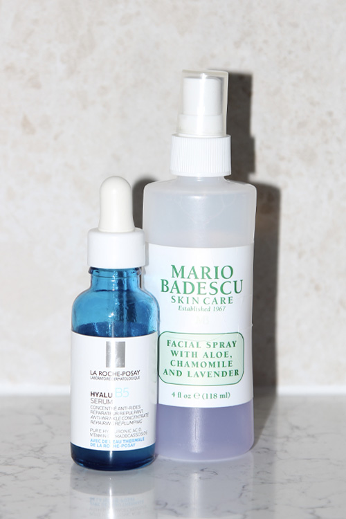 Next, layer either a peptide serum or hyaluronic acid serum, misting between layers to keep your  skin plump. The Medik8 Liquid Peptides Serum is designed to firm and build collagen, while the La Roche Posay Hyalu B5 Serum is the perfect hyaluronic acid + B5 blend for plump skin. Mist between layers with a calming facial spray—anything from Mario Badescu feels like you’re at the spa.