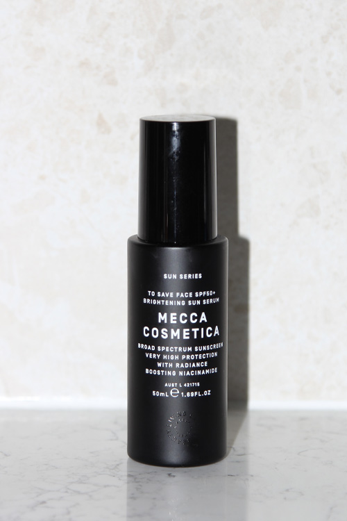And of course, SPF 50+ is a must. I’ve been using Mecca Superscreen 50+ for a decade because it just works. It doesn’t break me out, and the serum with niacinamide makes my skin look even better.