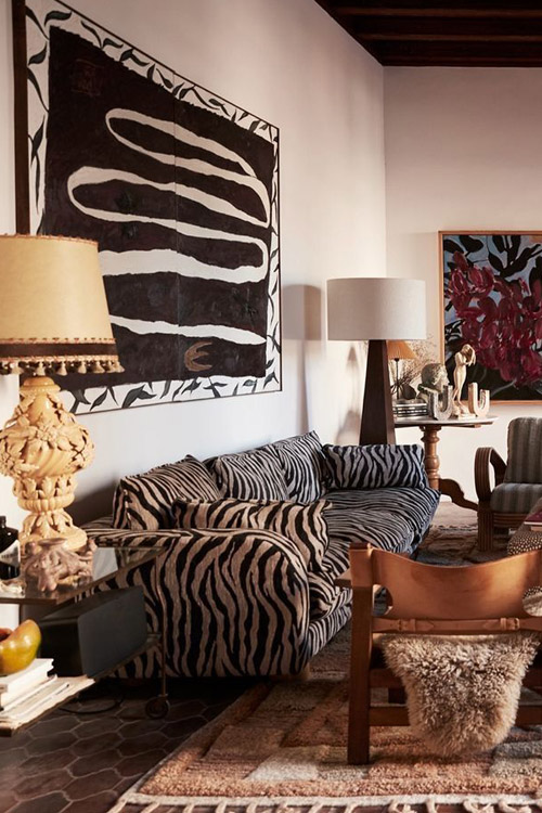 A pop of animal print is always in style. Patterns can be offset with stripes, plain furniture, and textured pieces. Make it pop with floral and abstract artwork for your walls.