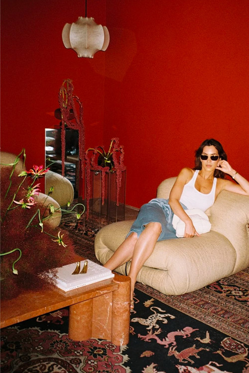 We’re obsessed with this vibrant true-red room. The bone armchair and lampshade are matchy-matchy, and the neutral dones in the marble coffee table and rug tie it all together. Pink tones offset the red for super feminine vibes.